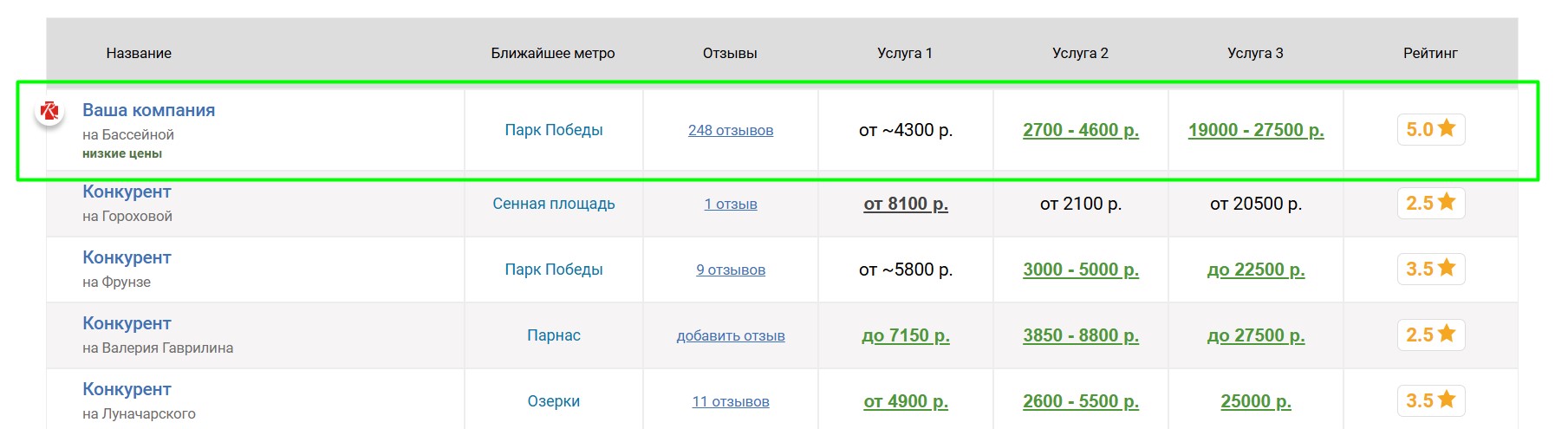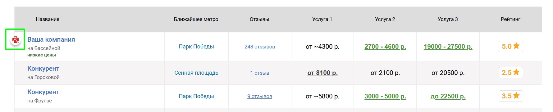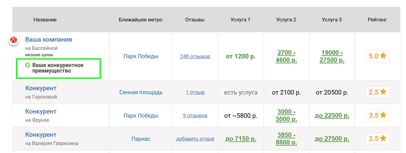 Вокруг продвигаемой таким образом фотостудии выбирается некоторое количество ближайших конкурирующих фотостудий, продвигаемая фотостудия попадёт к ним в таблицу «Сравнение по ценам», которая выглядит следующим образом: